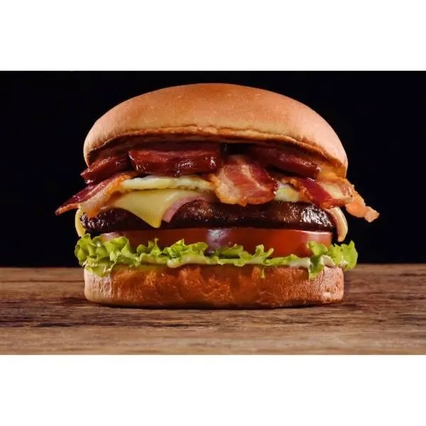 Pão de hambúrguer, catchup, maionese, alface, tomate, milho, batata palha, hambúrguer 90g, presunto, mussarela e bacon.