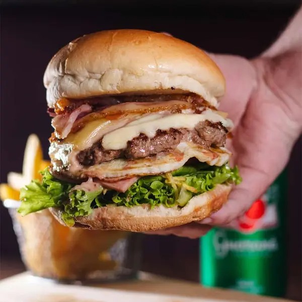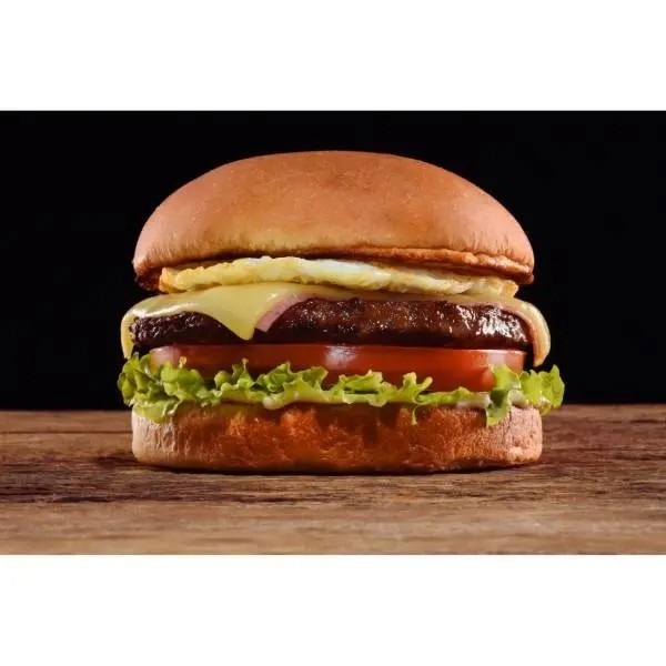 Pão de hambúrguer, catchup, maionese, alface, tomate, milho, batata palha, hambúrguer 90g, presunto, mussarela e ovo.
