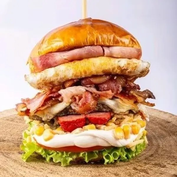 Pão de hambúrguer, catchup, maionese, alface, tomate, milho, batata palha, hambúrguer 90g, presunto, mussarela, bacon, ovo e calabresa.