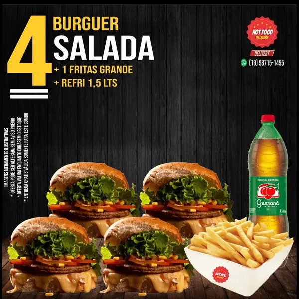 4 burguer salada + fritas grande + 1 antarctica de 1,5l