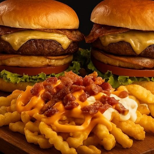 Apresentamos o novo formato dos nossos lanches em um combo duplamente delicioso: 2 Costela bacon + Fritas turbinada! Cada lanche é composto por um pão de brioche macio e dourado, harmoniosamente combinado com uma maionese defumada que agrega um sabor único. O destaque fica por conta do hambúrguer artesanal de costela com 120g, tão suculento que se desmancha na boca, uma camada de queijo mussarela derretido, que traz a cremosidade perfeita para o conjunto, e para finalizar alface e tomate frescos e crocantes