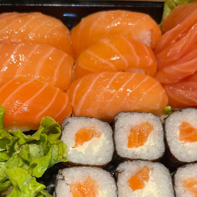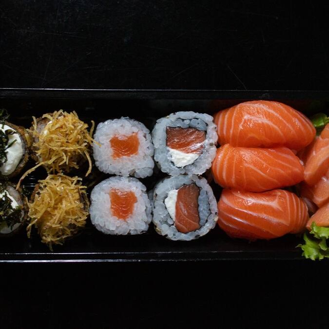44 peças sendo 16 sashimis de salmao , 10 niguri salmao, 6 jhous , 8 salmomakis , 4 uramaki de salmao