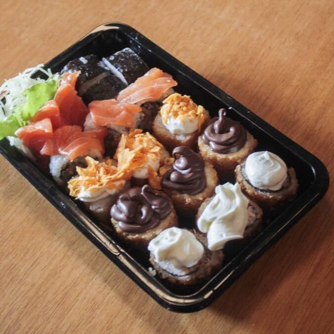 6 sashimis salmao , 3 hott holl , 3 salmomaki , 3 skin red , 3 banana com nutela , 3 jhou holl com Doritos
