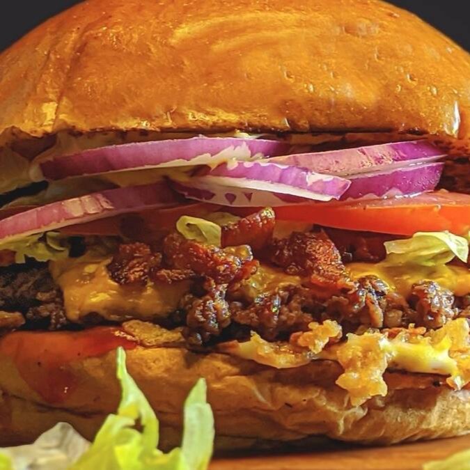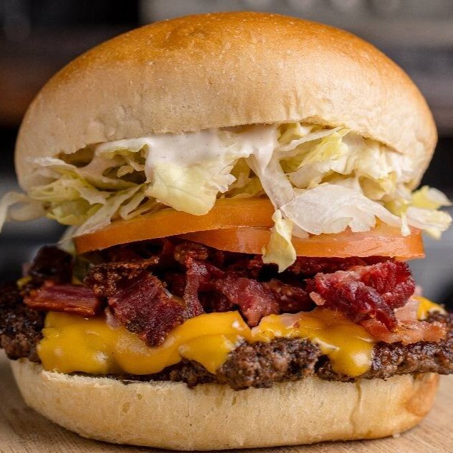 Pão, Alface, Tomate, Cebola Roxa, Bacon Crocante, Um Smash de 100g, Cheddar, Picles e Molho Da Casa.
