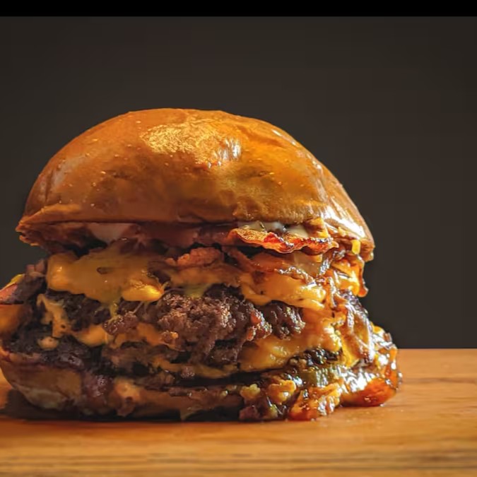 Pão, Três Smash De 100g, Cheddar, Bacon, Cebola Caramelizada, Picles e Molho Da Casa.