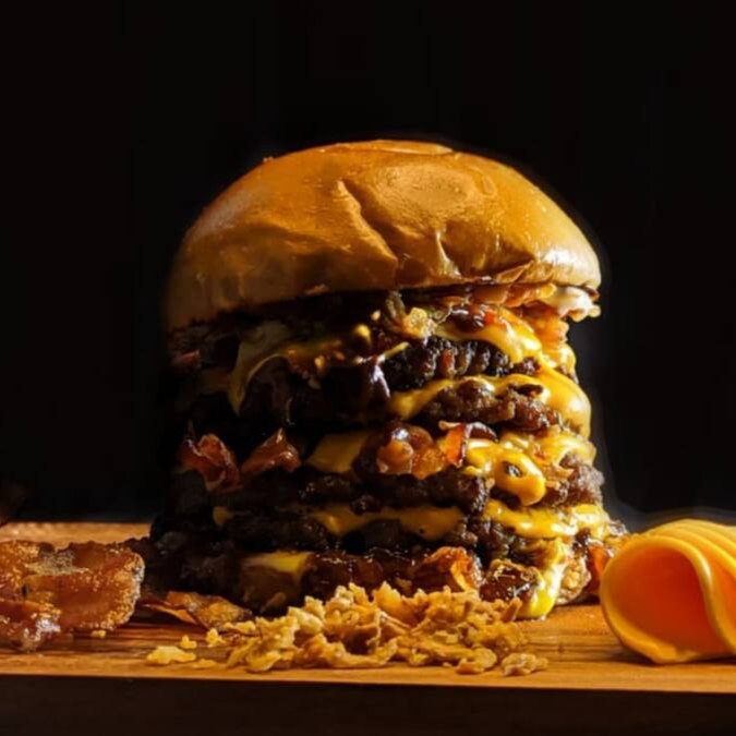 Pão Brioche, 4 Carne Angus De 110g, Cheddar, Bacon, Cebola Crispy, Cebola Caramelizada, Barbecue, Picles e Molho Da Casa ( Ketchup E Mostarda )