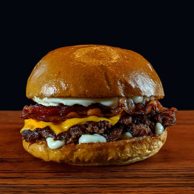 Pão, Um Smash de 100g, Cheddar, Bacon e Molho da Casa.