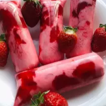 Delicioso Geladinho de Base de Morango com Pedaços da Fruta e Calda de Morango