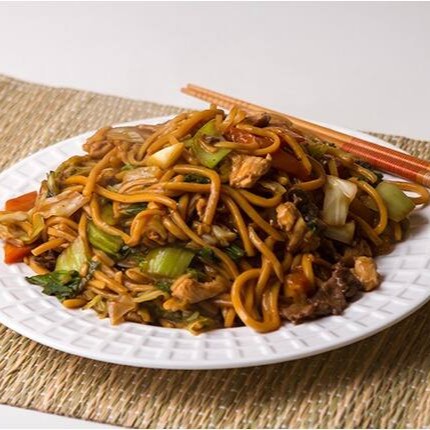 carne bovina, filé de frango em tiras, macarrão, molho a base de shoyu