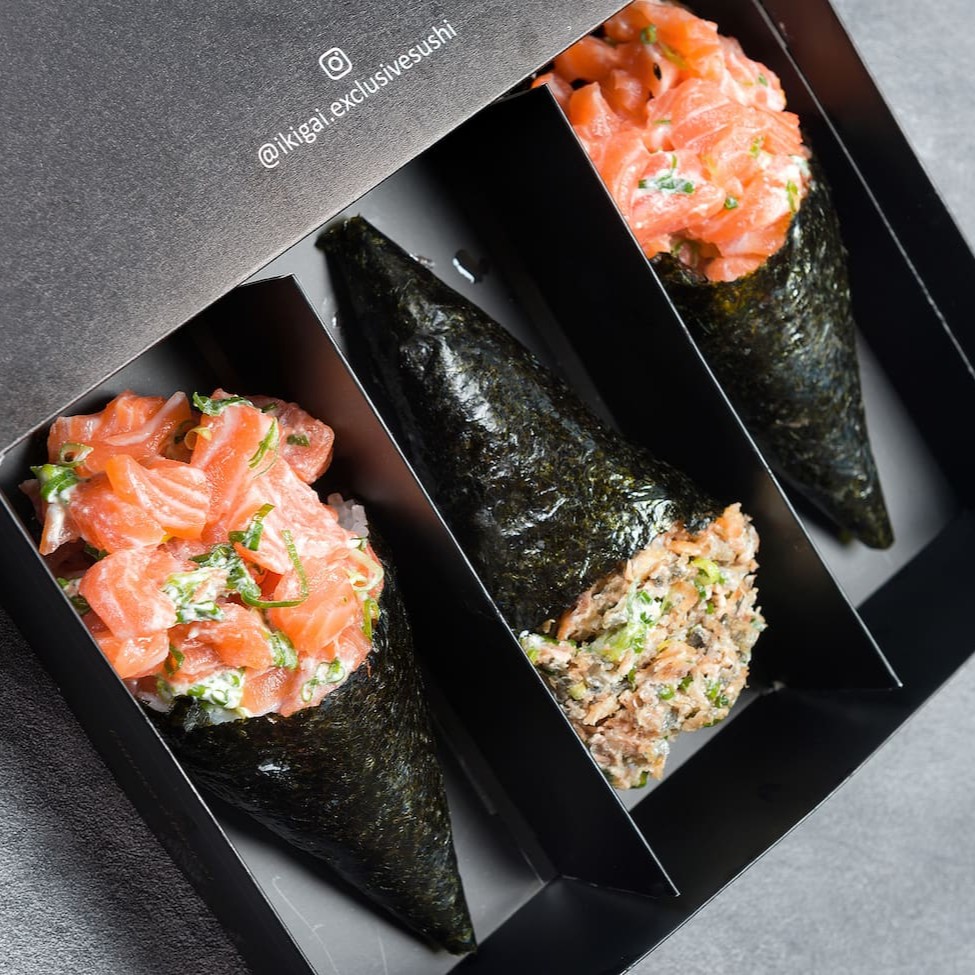 1 Temaki de Salmão, Cream Cheese e Cebolinha. 1 Temaki de Salmão, Cream Cheese e Couve. 1 Temaki de Salmão, Cream Cheese e Doritos. (este item não permite alterações)