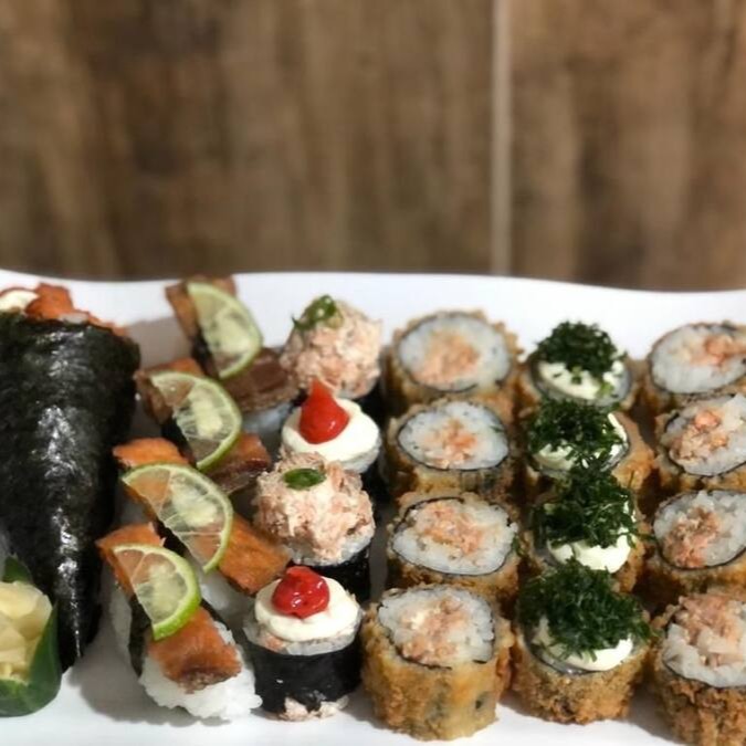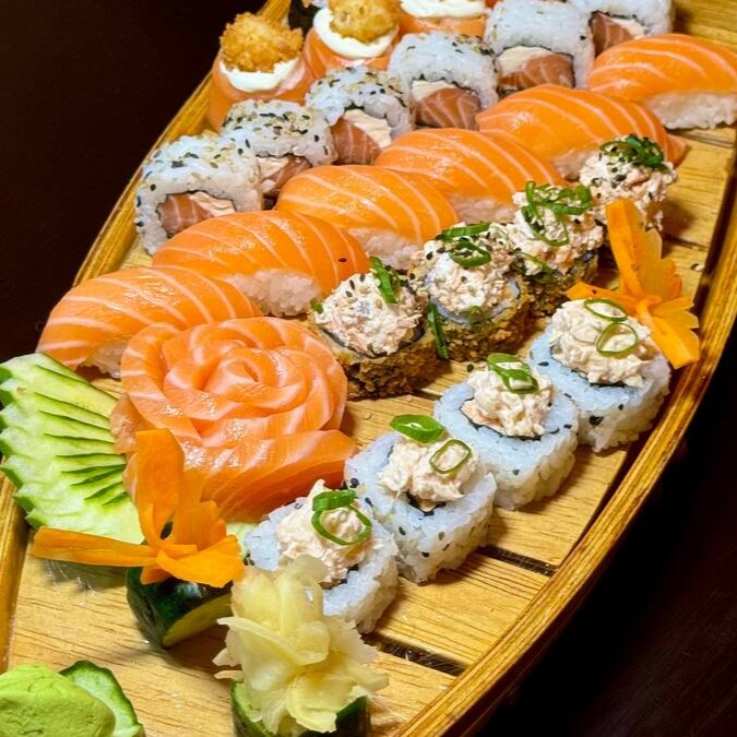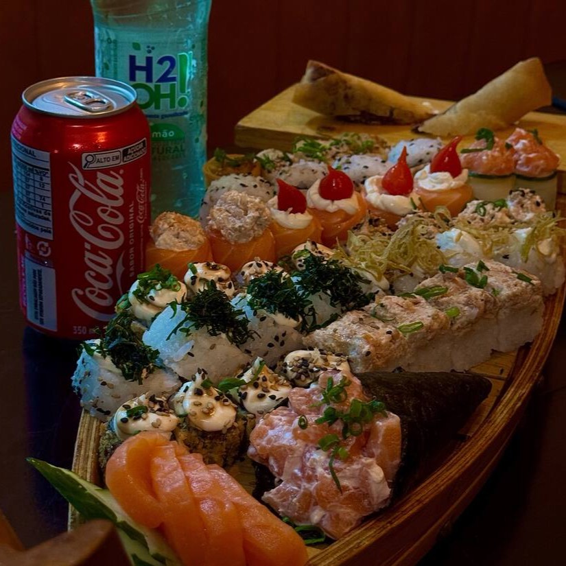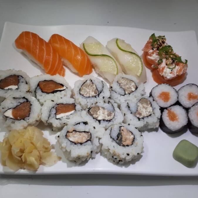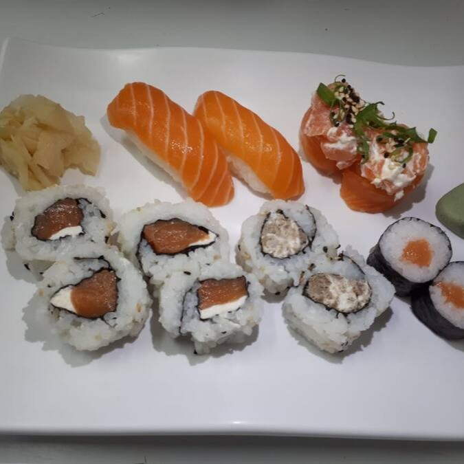 4 hot especial, 4 uramaki de salmão grelhado, 6 uramaki de salmão, 6 sashimis, 6 niguiri, 4 joe ebi e 2 rossomaki de salmão.