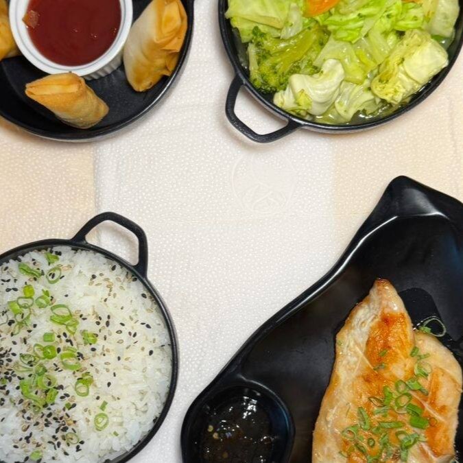 Filé de salmão grelhado, arroz gohan, 04 hossomakis e legumes grelhado