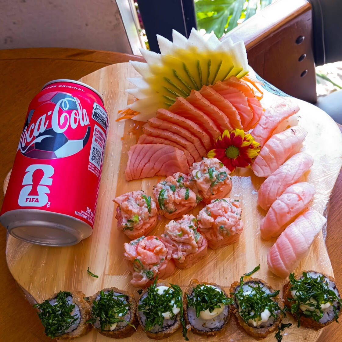 10 sashimis de salmão, 6 jhous, 5 niguiri de salmão e 6 hot roll com creme chess e couve crispy + coca cola lata 350 ml