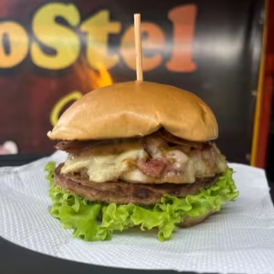 Pão brioche,hambúrguer 90g, ovo, bacon, presunto, mussarela, Catupiry, alface e tomate.