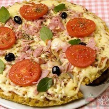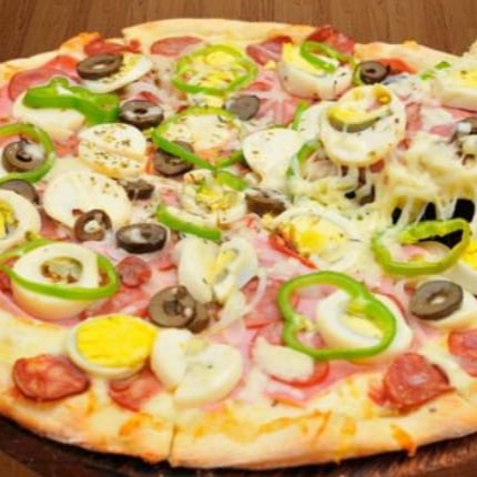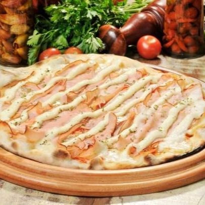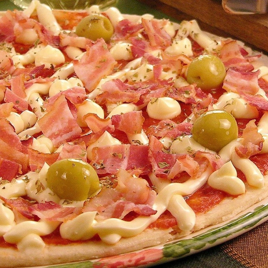 Massa artesanal , molho caseiro italiano , Presunto picado, ovo e cebola cobertos com mussarela e azeitonas.