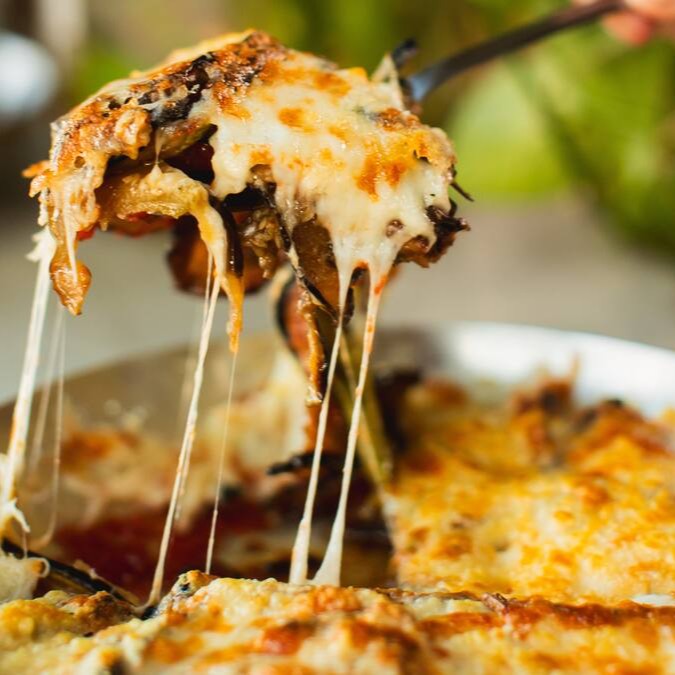Fatias de berinjela, abobrinha e tomate, com generosa camada de queijo mussarela e grana padanp, gratinados no forno a lenha