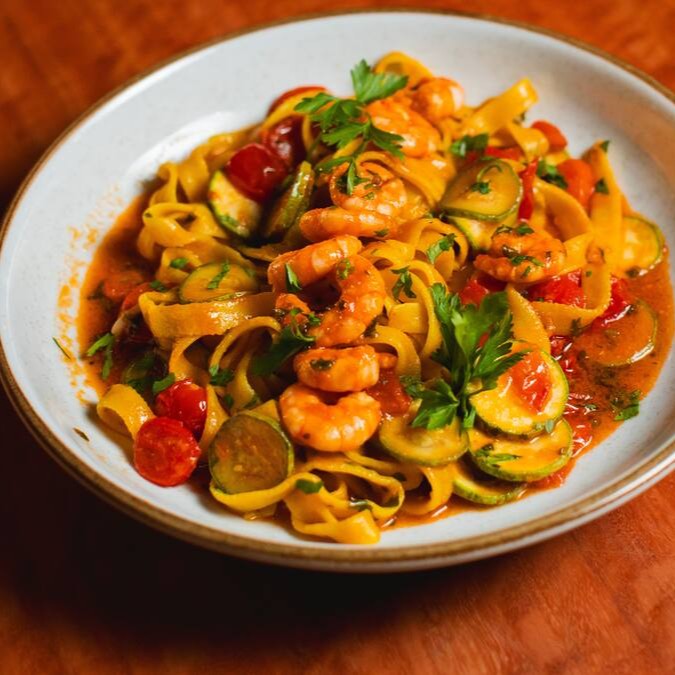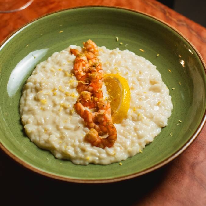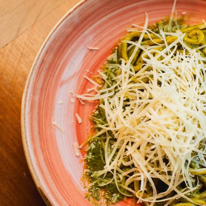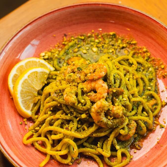 Saborosa combinação de pesto de pistache e camarão, feito com grana padano, manjericão, pimenta do reino, finalizado com raspas de limão siciliano