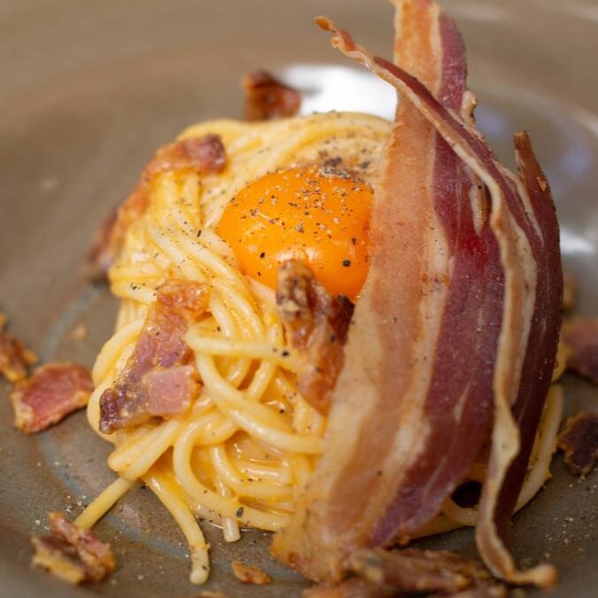 A verdadeira carbonara, feita com guanciale produzido na casa, creme de gema de ovo, grana padano e finalizado com pimenta do reino.