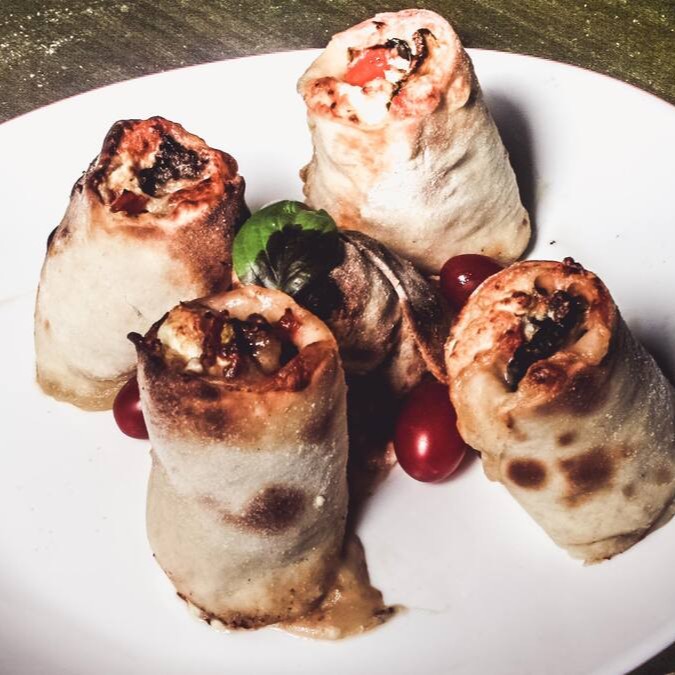 Massa de pizza enrolada com recheio de abobrinha, berinjela, cubos de tomate, ricota, queijo mussarela e grana padano. 5 unidades