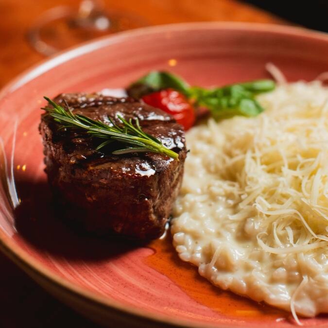 Filé mignon grelhado, acompanha risotto de grana padano ou spaghetti ao sugo