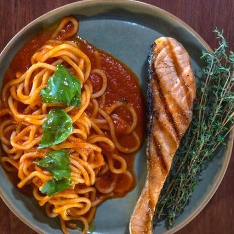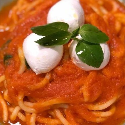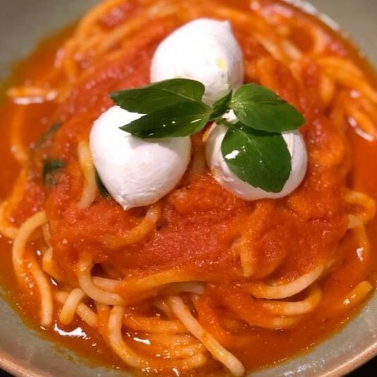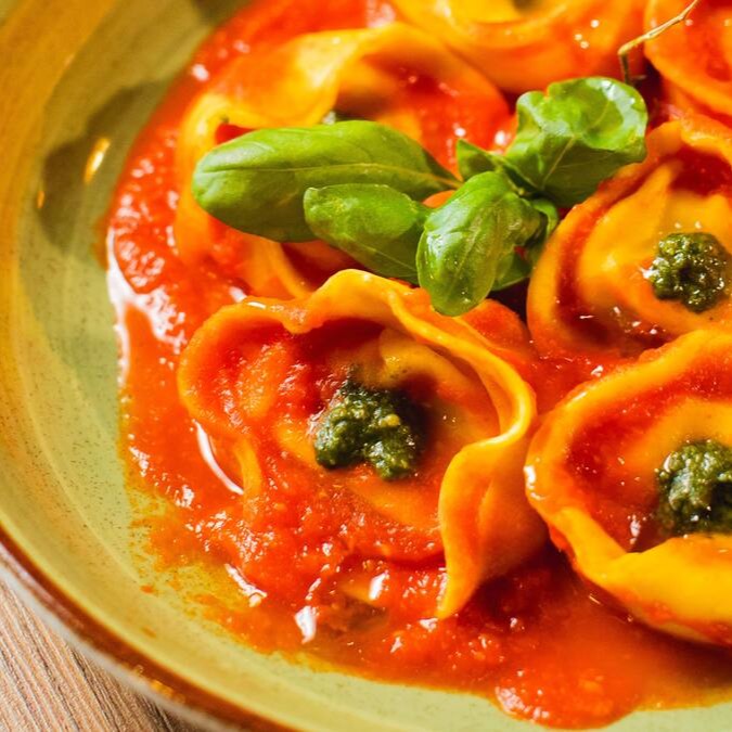 Massa fresca recheada com mussarela de bufala e manjericão finalzada com molho de tomatinho cereja cozido a baixa temperatura e com manjericão fresco