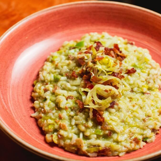 Simples e surpreendente, preparado com alho poró e bacon produzido na casa