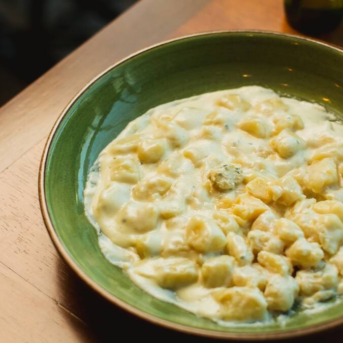 Nhoque de batatas coberto com molho de queijo parmesão, gorgonzola, mussarela e o legítimo Catupiry