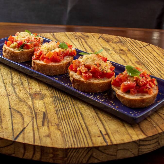 (4 unidades) tradicional pão italiano de fermentação natural com cubos de tomate, temperado com alho e majericão e gratinado com queijo grana padano