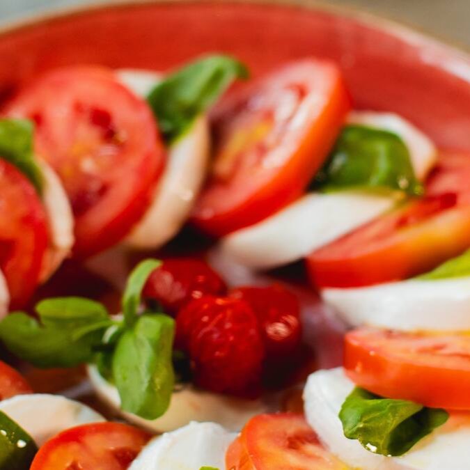 Deliciosas fatias de tomate, mussarela de búfula, manjericão e orégano.