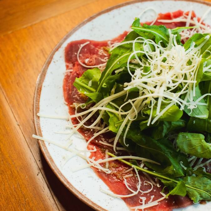 Finas fatias de filé mignon cru, temperado com azeite, sal, pimenta do reino sobre leite de rúcula.