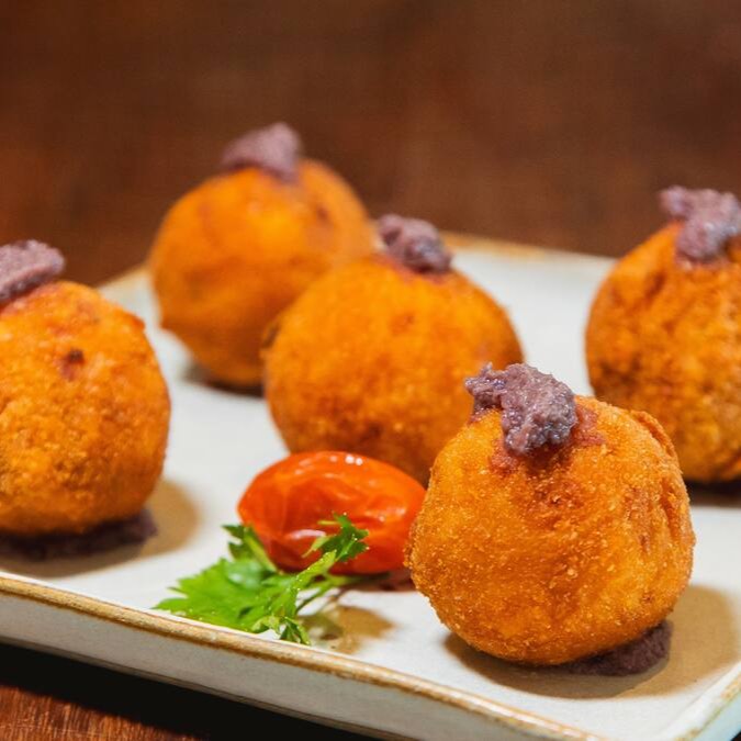 Iguaria italiana, feita com arroz de risotto ao molho sugo, recheado com mussarela, empanado e frito. Finalizado com pesto de manjericão. (200g)
