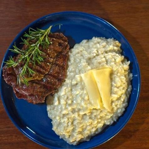 Bife ancho grelhado, acompanha risotto de grana padano ou spaghetti ao sugo.