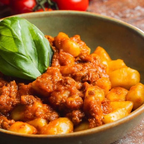 Nhoque de batatas coberto de molho de tomate com carne cortada na ponta da faca por 3 horas