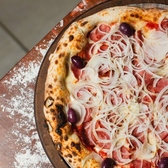 Massa crocante de pizza, salpicada de queijo grana padano e assada no forno a lenha