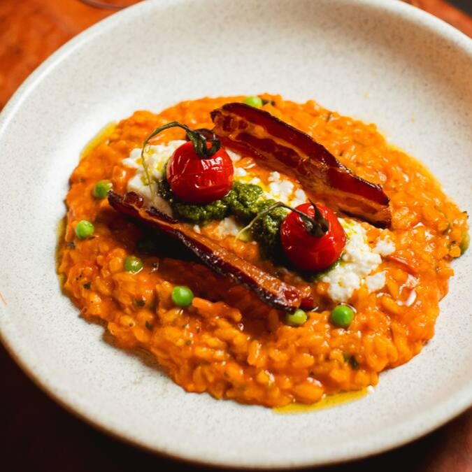 Preparado com pomodoro, ervilha, creme de bufala, pesto, pancetta croccante feita na casa e finalizado com tomatinh confitado