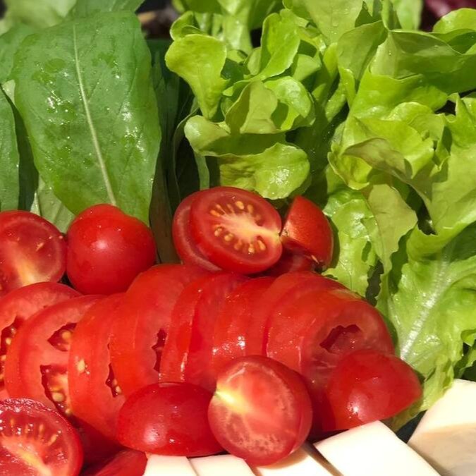 Mix de folhas verdes com tomate,tomate cereja cebola, palmito e radichio