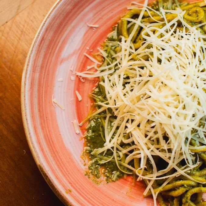 O delicioso molho feito de manjericão fresco, nozes e grana padano, temperado com azeite e alho.