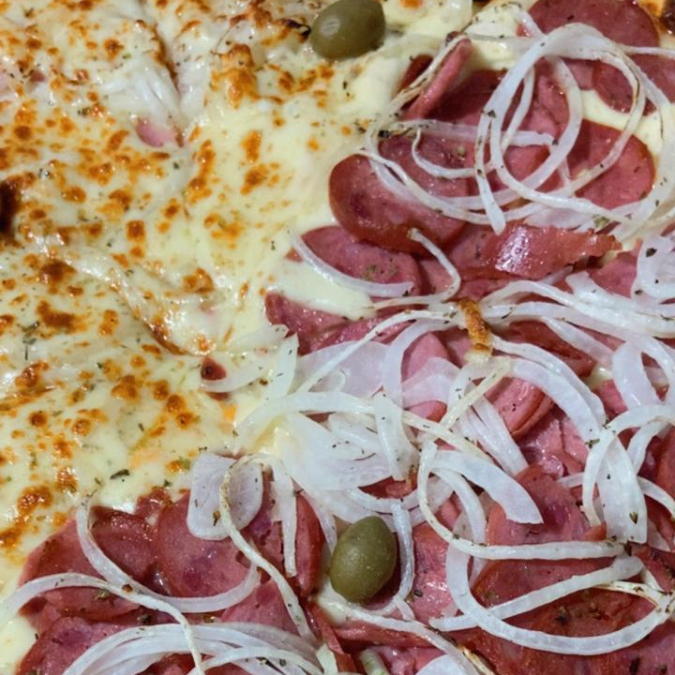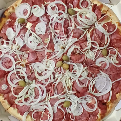 Deliciosa pizza com fatias de calabresa, cebola roxa e azeitonas pretas.