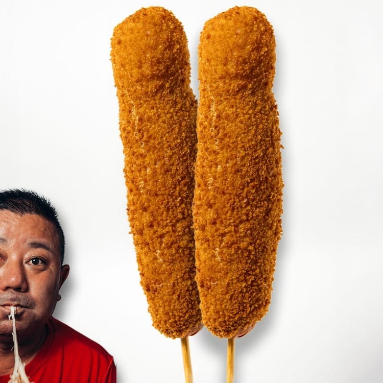 Salsicha + queijo derretido, empanados em panko crocante e fritos na hora. Textura, sabor e suculência no mesmo lanche. Um dos mais pedidos do Japa!
