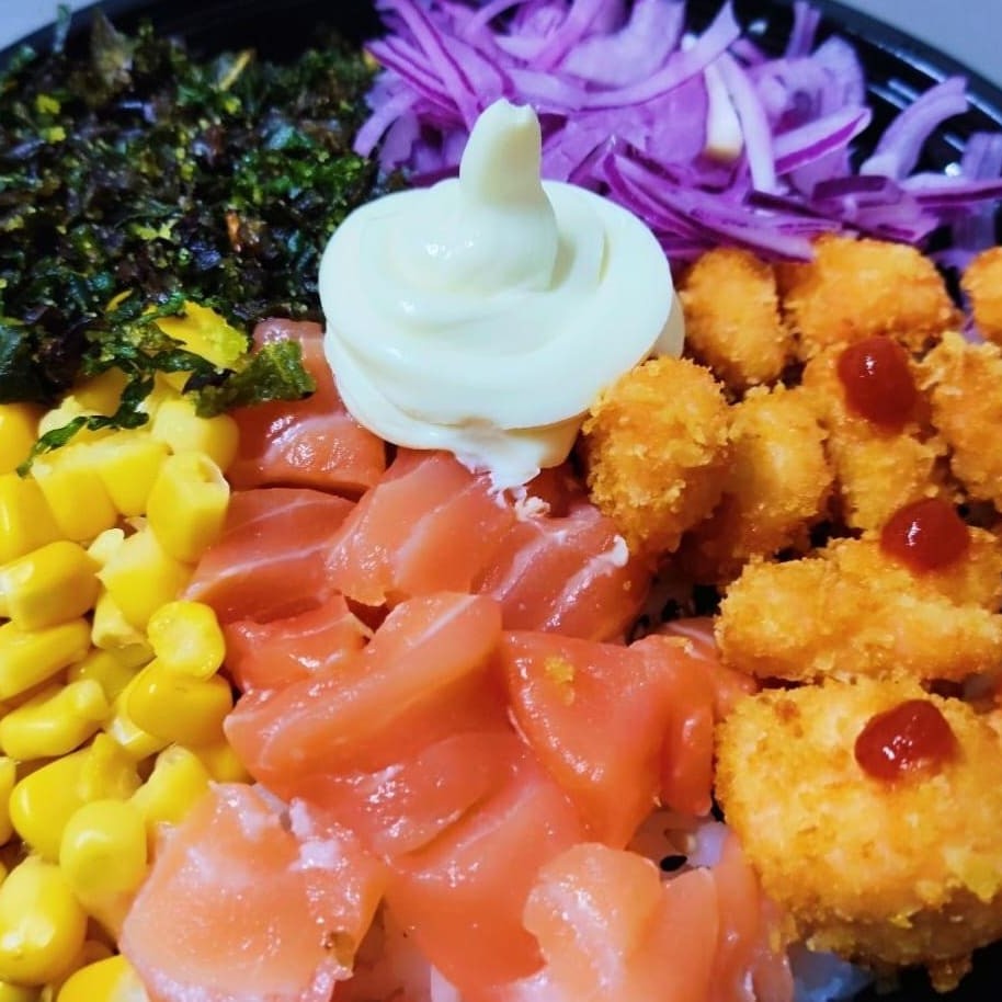 Arroz, Salmão Fresco, Salmão em cubos empanado, Cebola Roxa, Milho, Couve Crispy 350gr