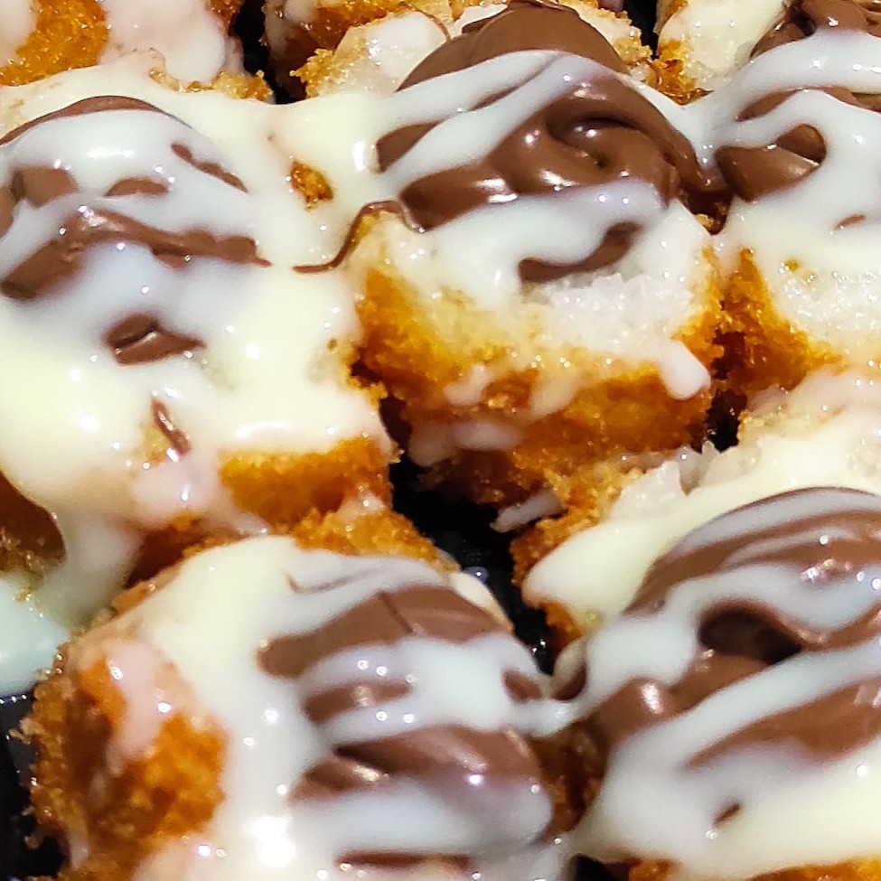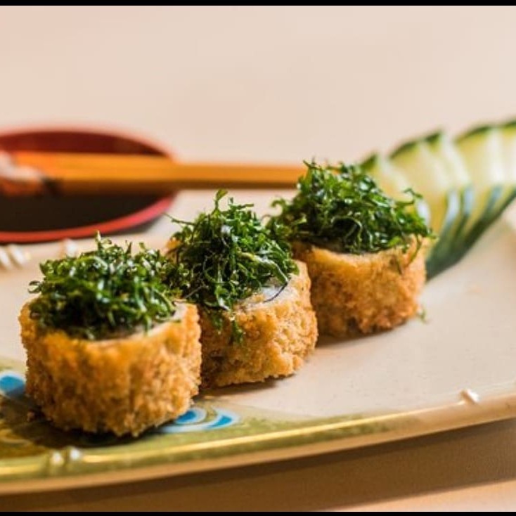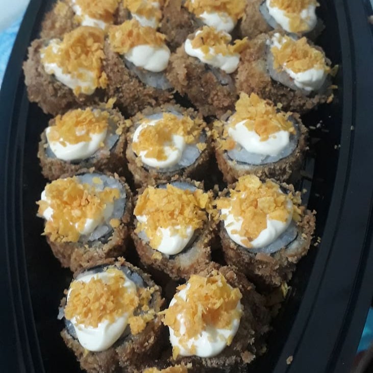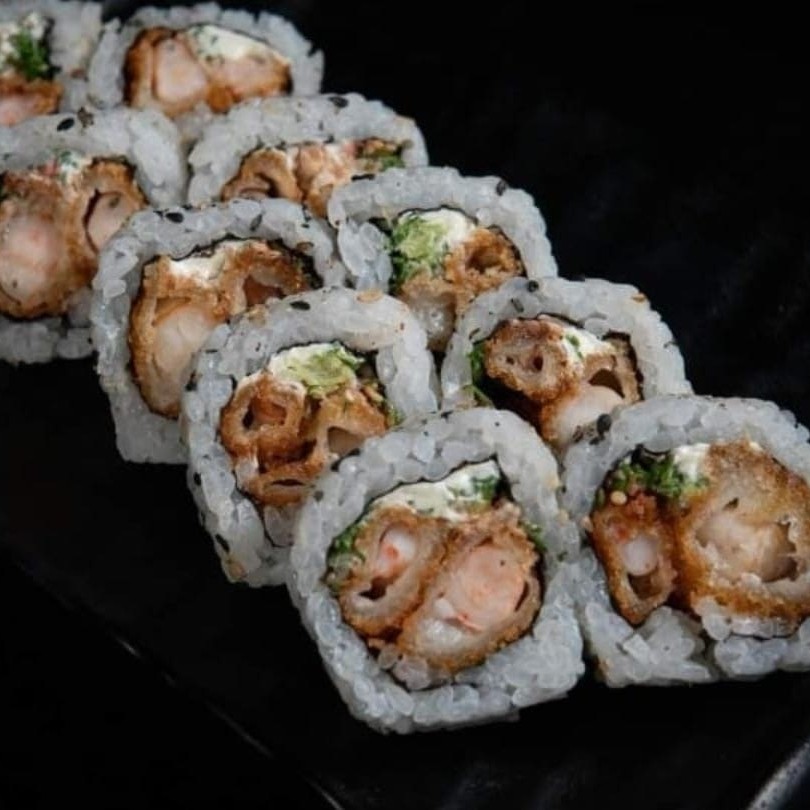Enrolado de arroz, gergelim, camarão empanado, cream cheese e cebolinha. Porção 10 unidades. Obs. Não acompanha molho e hashi.