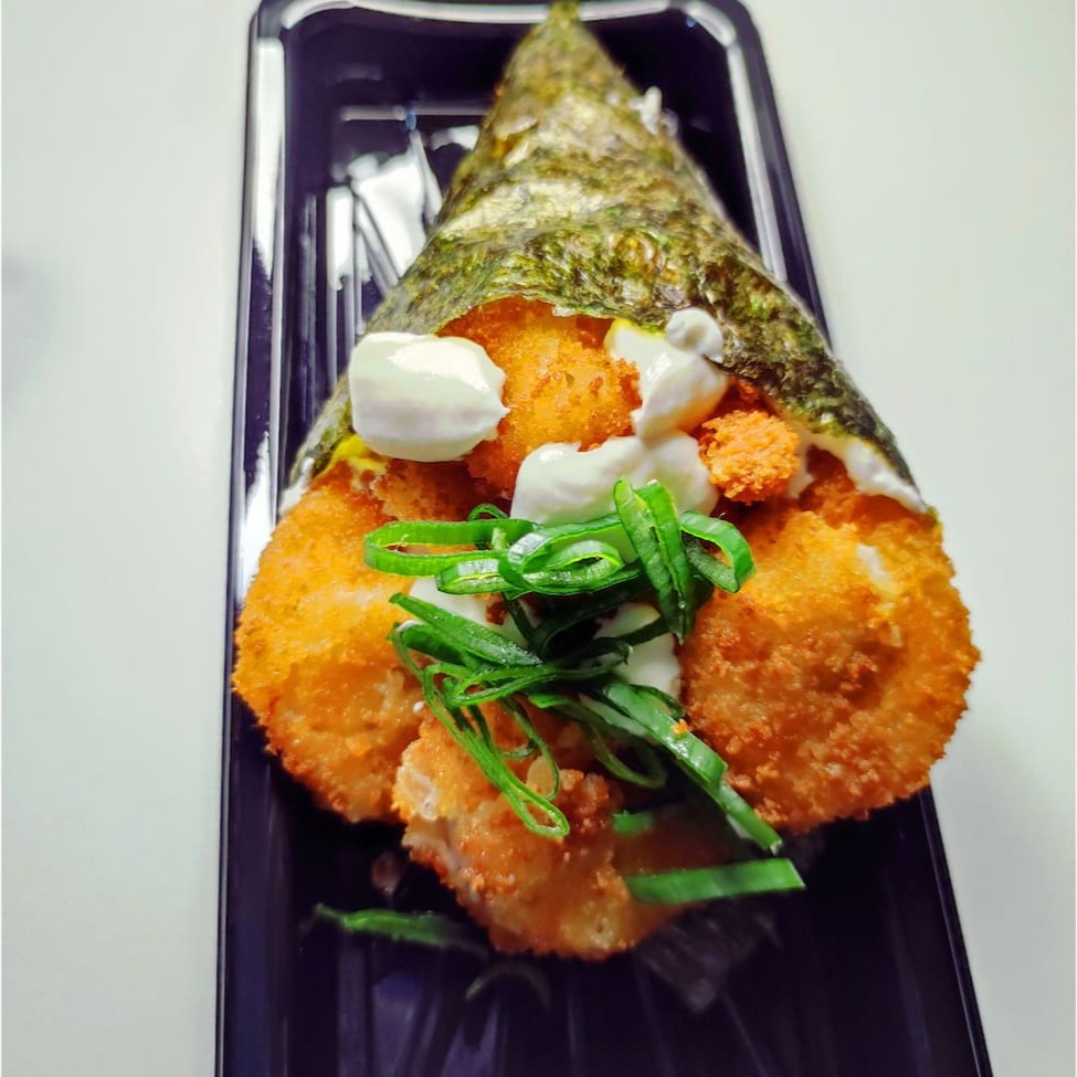 Temaki de arroz, camarão empanado, cream cheese e cebolinha. Obg não acompanha Molho.