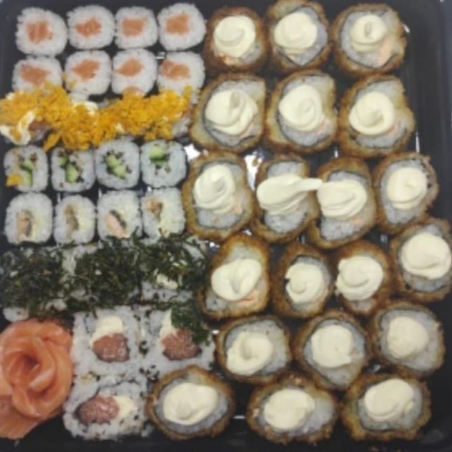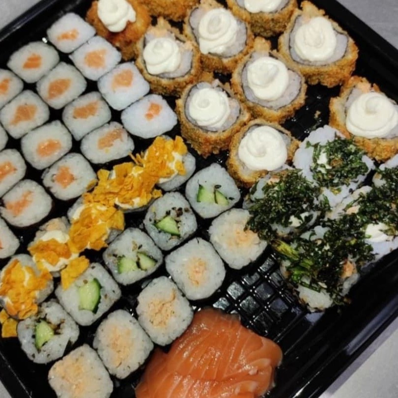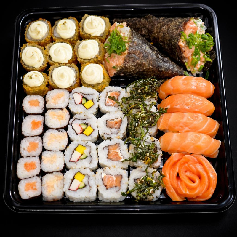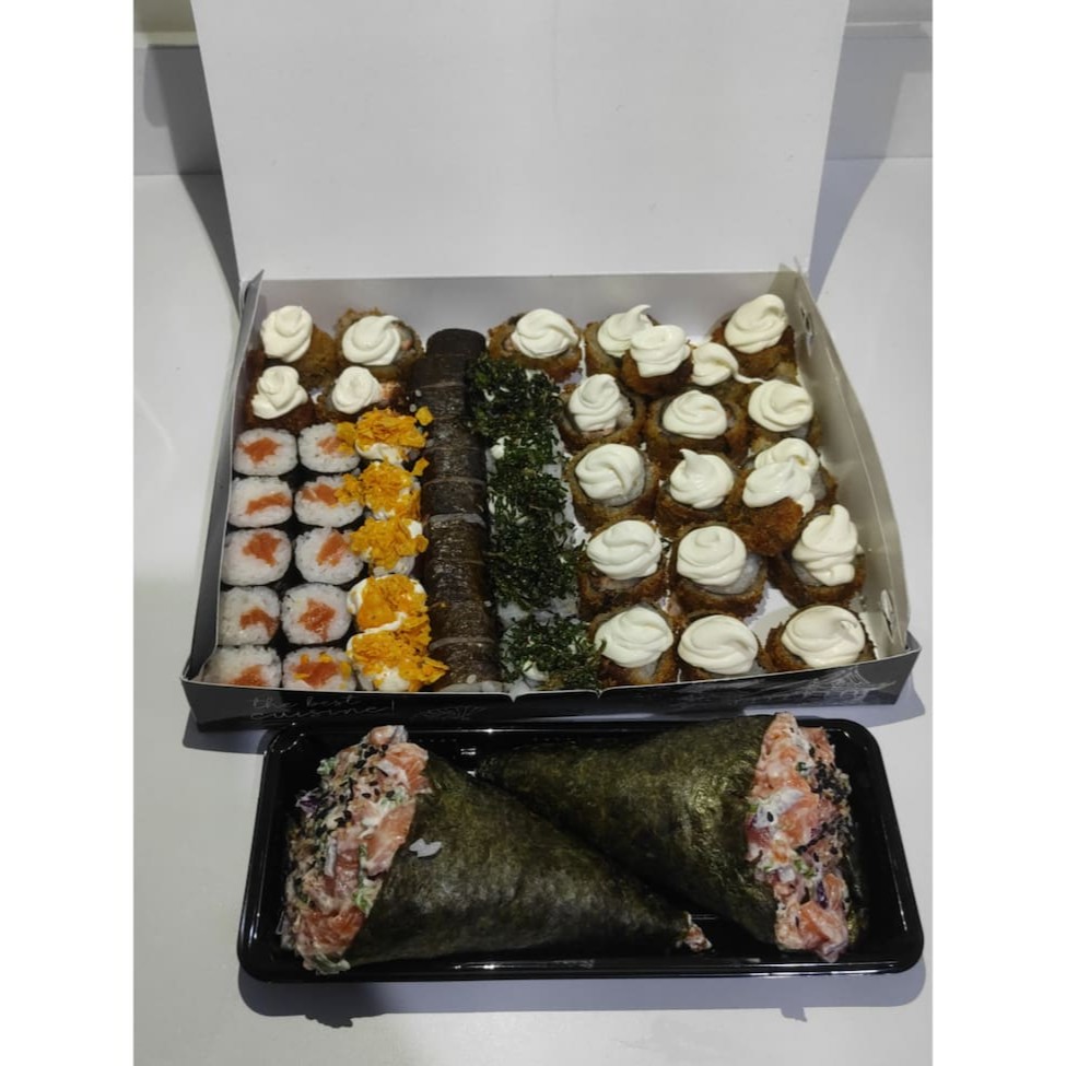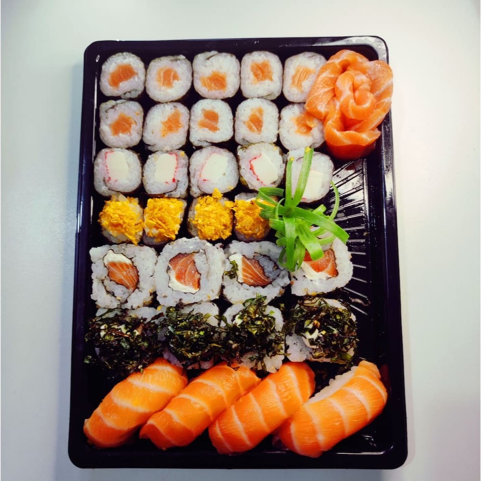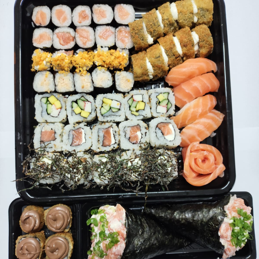20 hossomaki salmão, 05 Sashimi de salmão, 05 sushi Doritos, 05 sushi pepino, 05 sushi skin, 05 uramaki skin, 10 hot holl. Não acompanha Molhos e hashi.