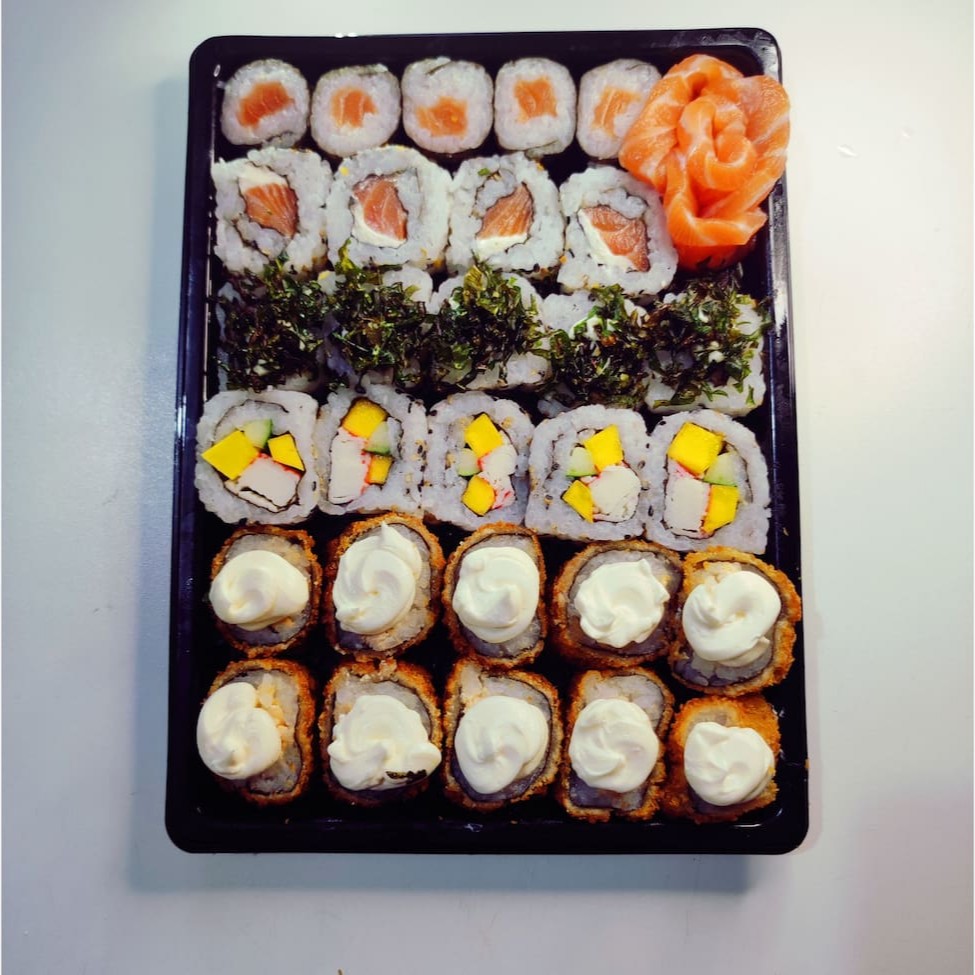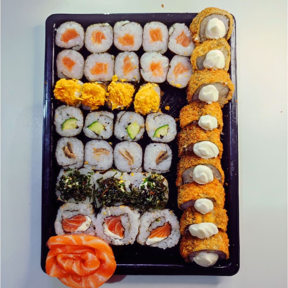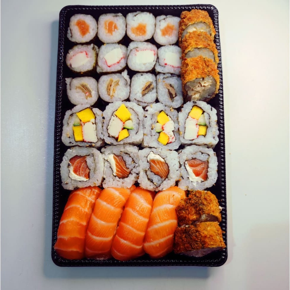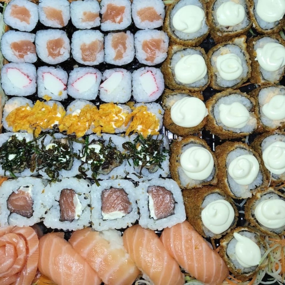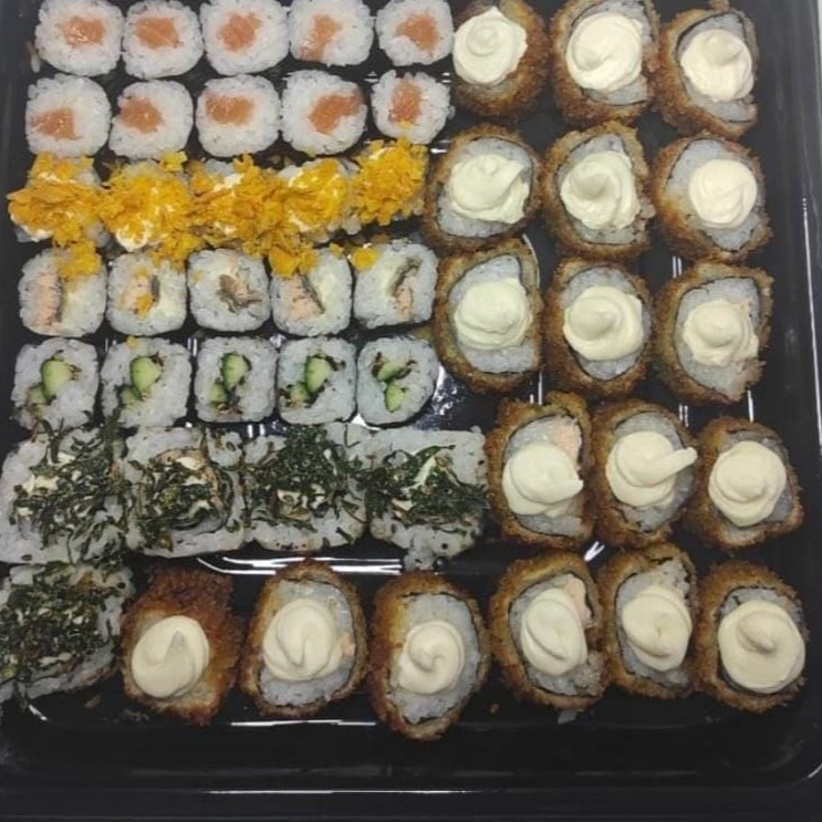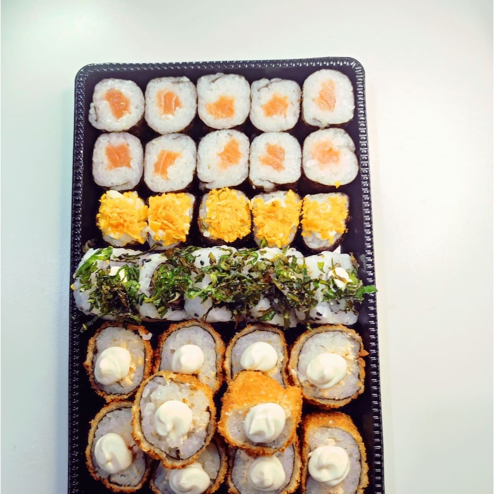 20 hossomaki salmão, 05 Sashimi de salmão, 05 sushi Doritos, 05 sushi pepino, 05 sushi skin, 05 uramaki skin, 10 hot holl. Não acompanha Molhos e hashi.
