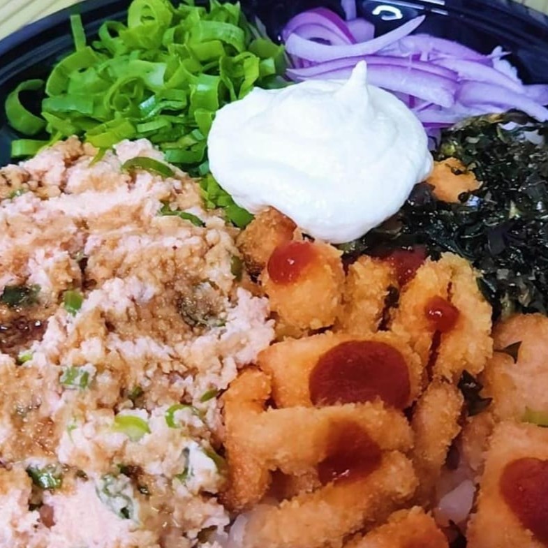 Salmão em cubos empanado, salmão grelhado, arroz japones, couve crispy, cebolinha, cebola roxa e cream cheese, Opcional Pimenta Oriental. 425gr