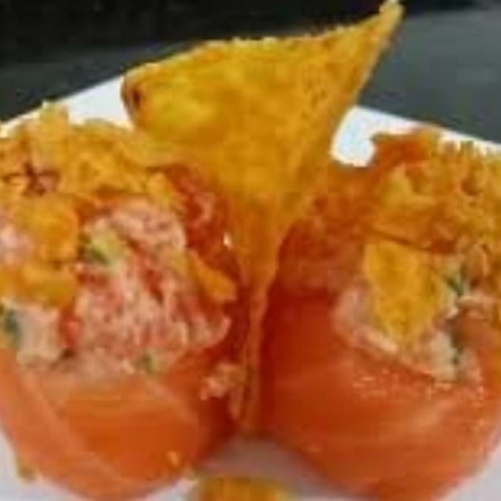 Hot Holl de arroz, salmão, cream cheese, e couve Crispy. Não acompanha molho e hashi favor incluir no pedido.