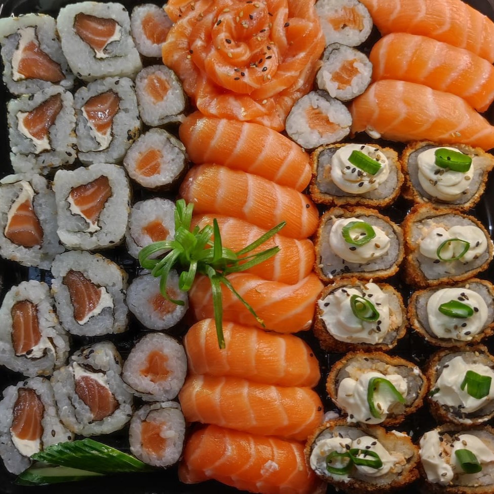 10 sashimi salmão, 10 niguiri salmão , 10 hot holl, 10 uramaki salmão, 10 hossomaki salmão, obs. Não acompanha Molho e Hashi