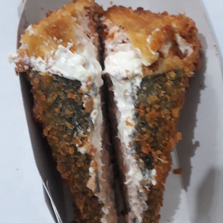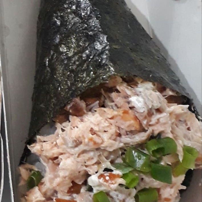 Temaki de Arroz, Salmão empanados em cubos fritos, cream cheese e Cebolinha. Não acompanha molho.