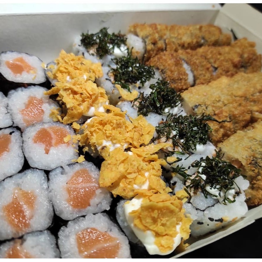 20 hot holl 10 hossomaki salmão 05 hossomaki Doritos 05 uramaki skin obs. Não acompanha molhos e hashi favor adcionar ao pedido.