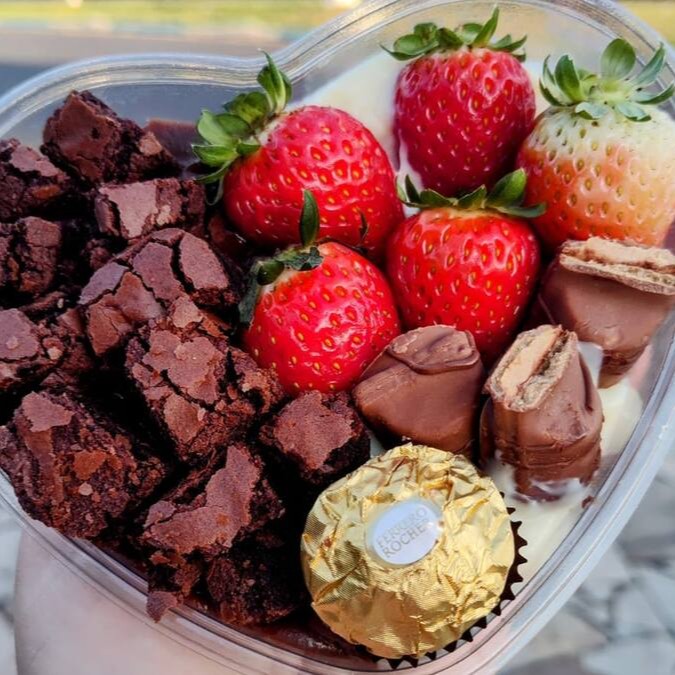 Encante-se com o nosso 'Mini Fondue Coração', . Esta delícia vem em uma charmosa embalagem em formato de coração, recheada com sedosos brigadeiros artesanais que servem de base para um irresistível brownie, frescos morangos suculentos, deliciosos chocolates Kinder e um requintado bombom Ferrero. Uma verdadeira experiência gastronômica de amor e sabor!